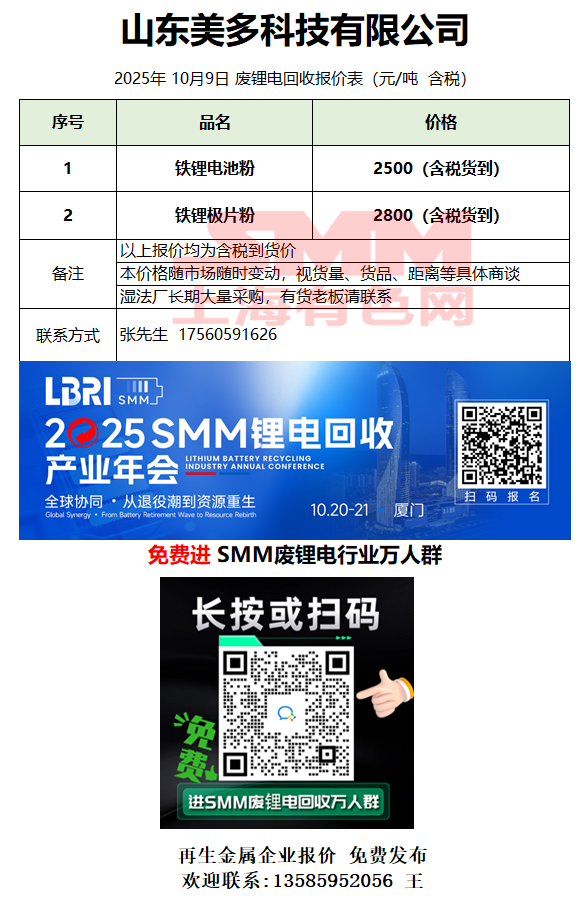 10月9日山东美多 废锂电采购报价