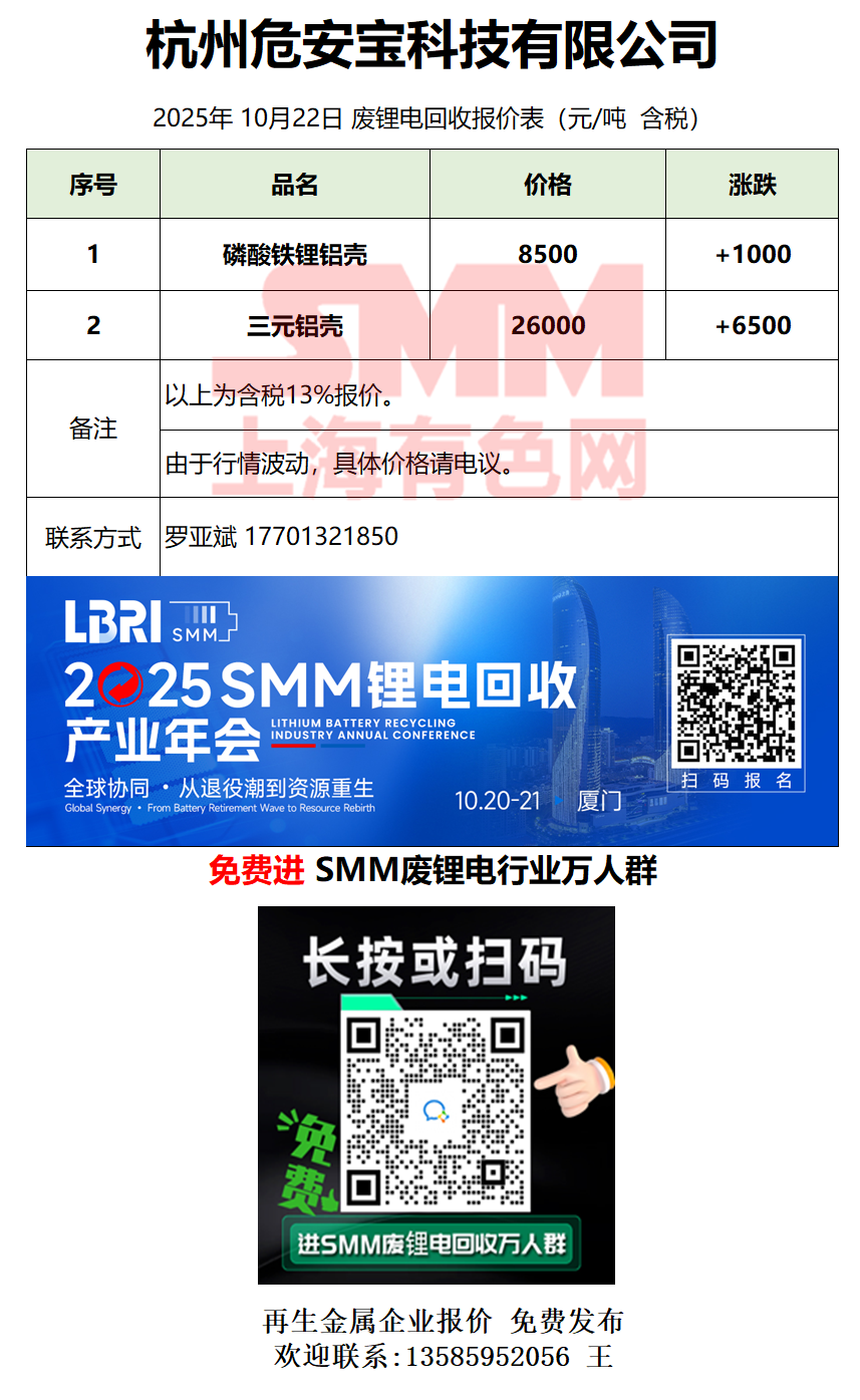10月22日杭州危安宝 废锂电采购报价