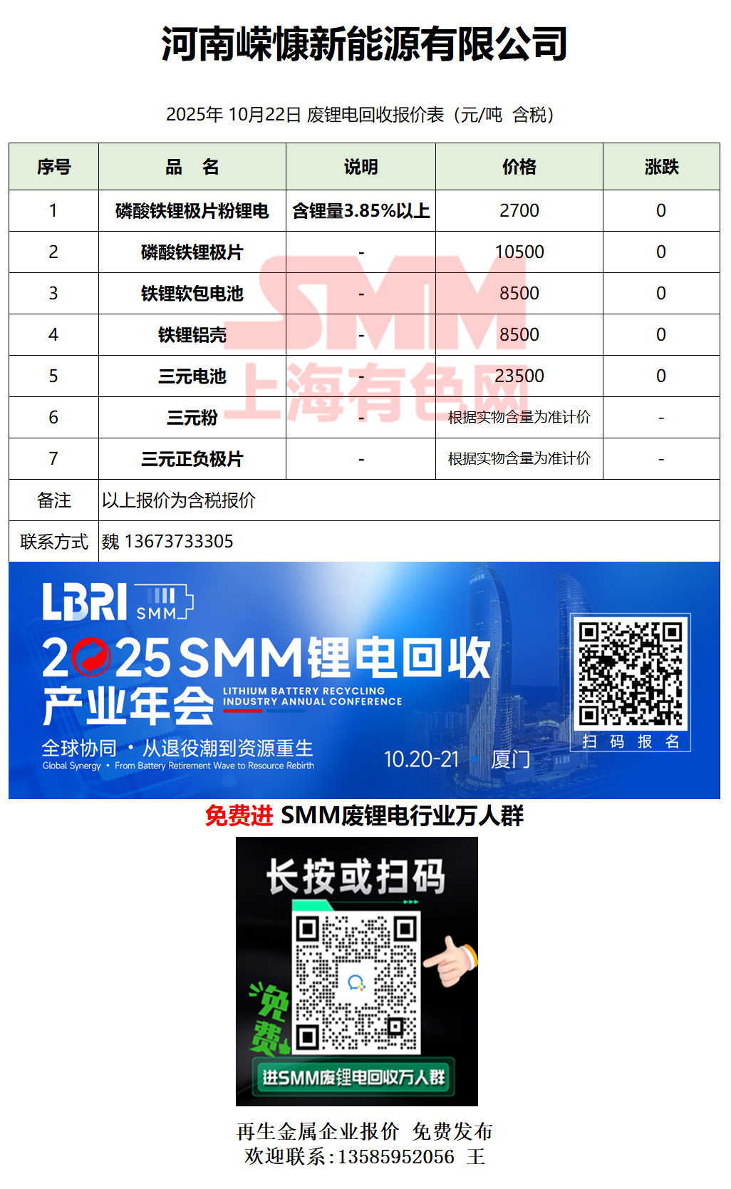 10月22日河南嵘慷 废锂电采购报价
