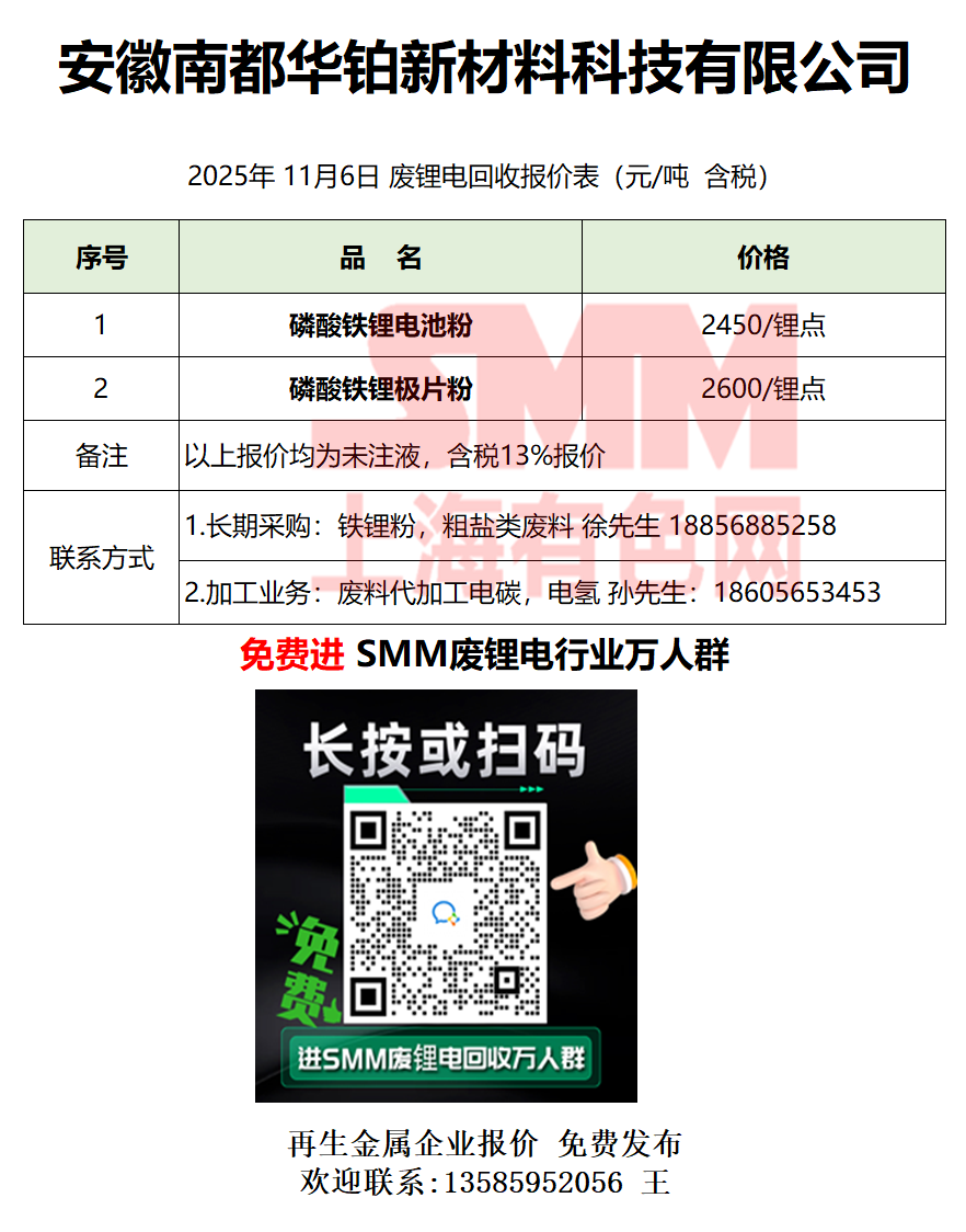 11月6日安徽华铂 废锂电采购报价