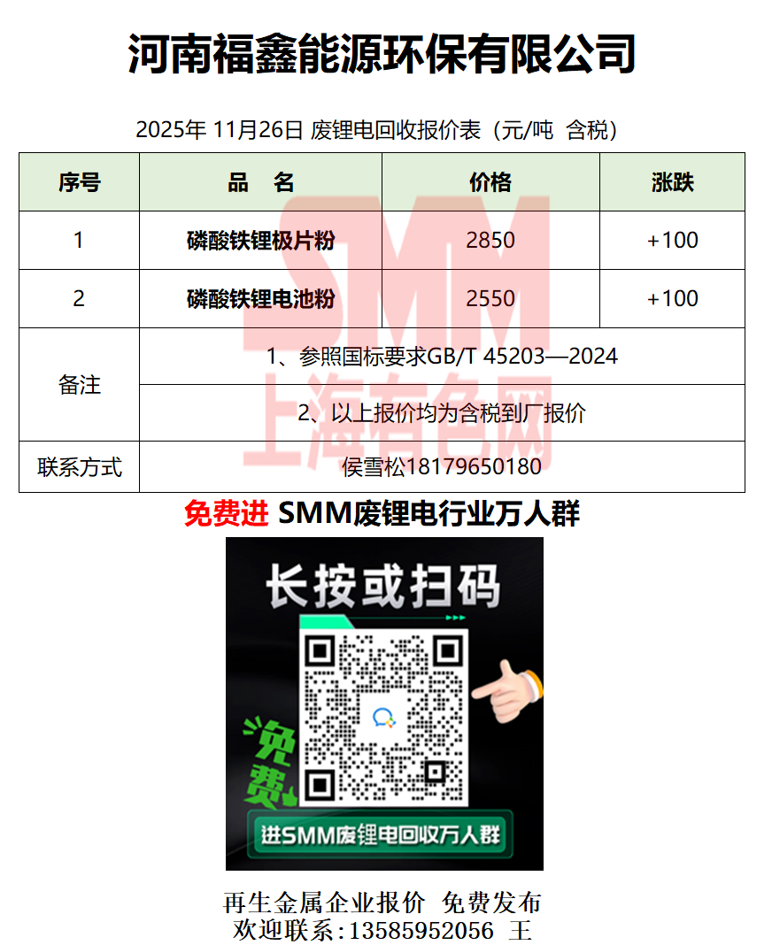 11月26日河南福鑫 废锂电采购报价
