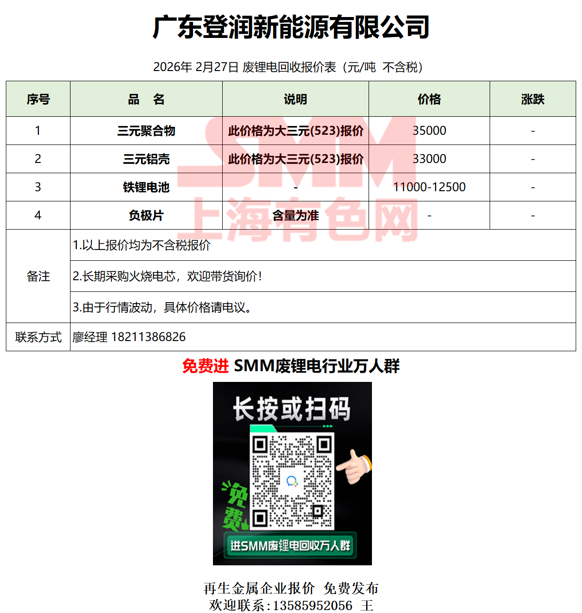 2月27日广东登润 废锂电采购报价