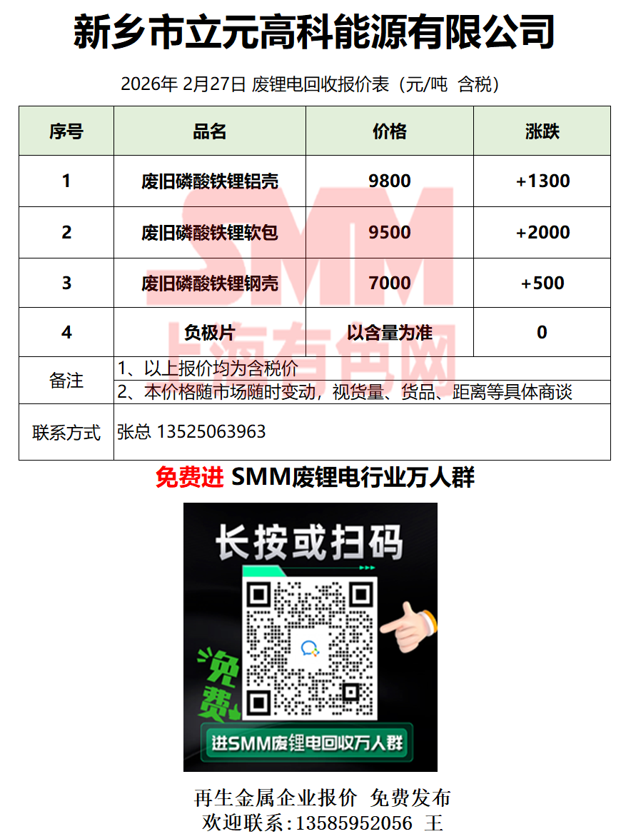 2月27日立元高科 废锂电采购报价