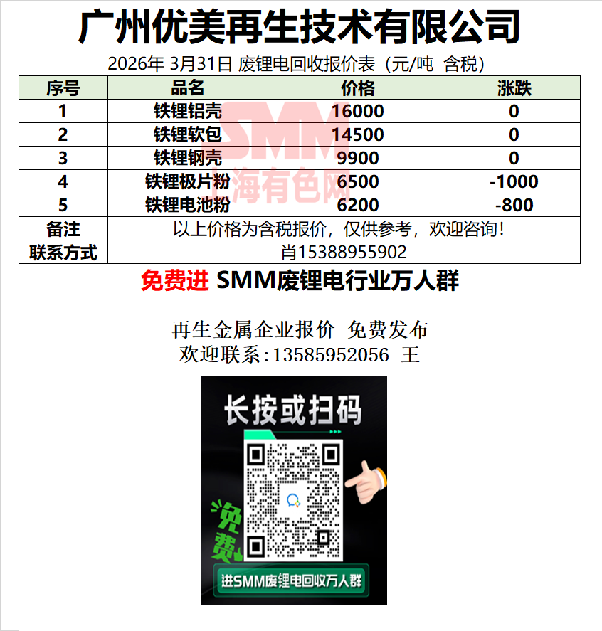 3月31日广州优美 废锂电采购报价