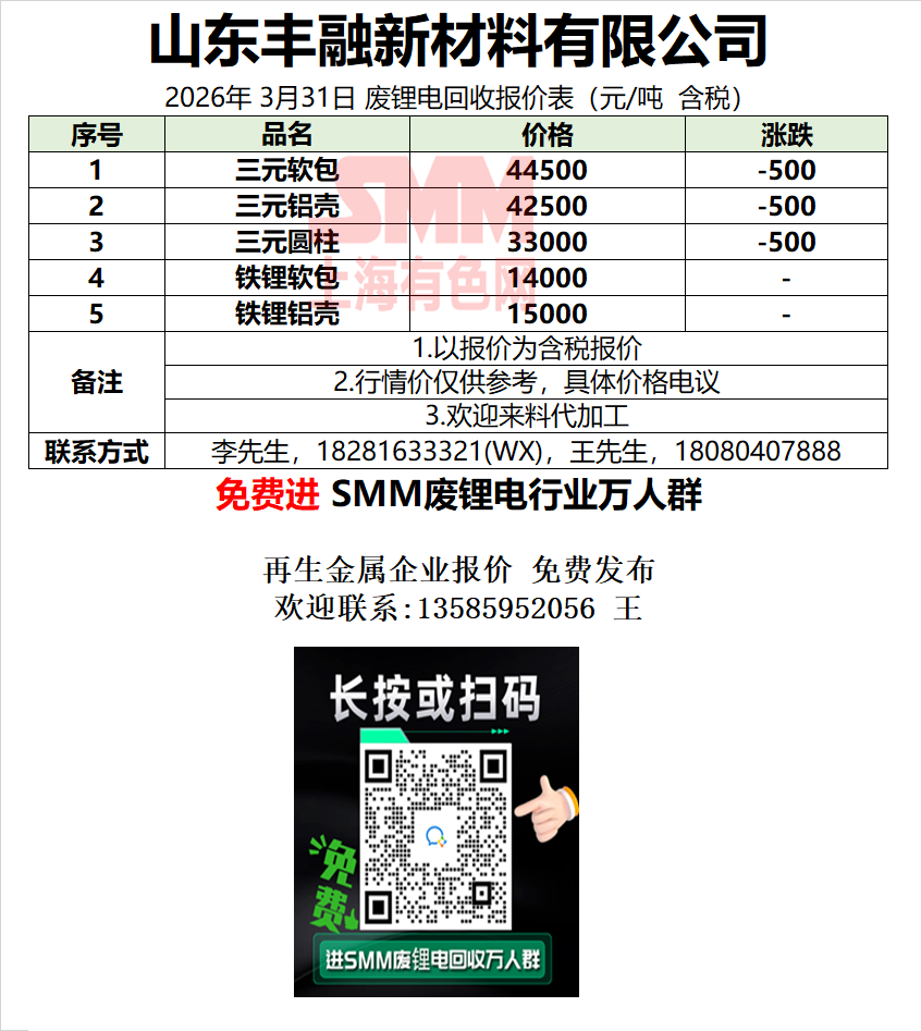 3月31日山东丰融 废锂电采购报价