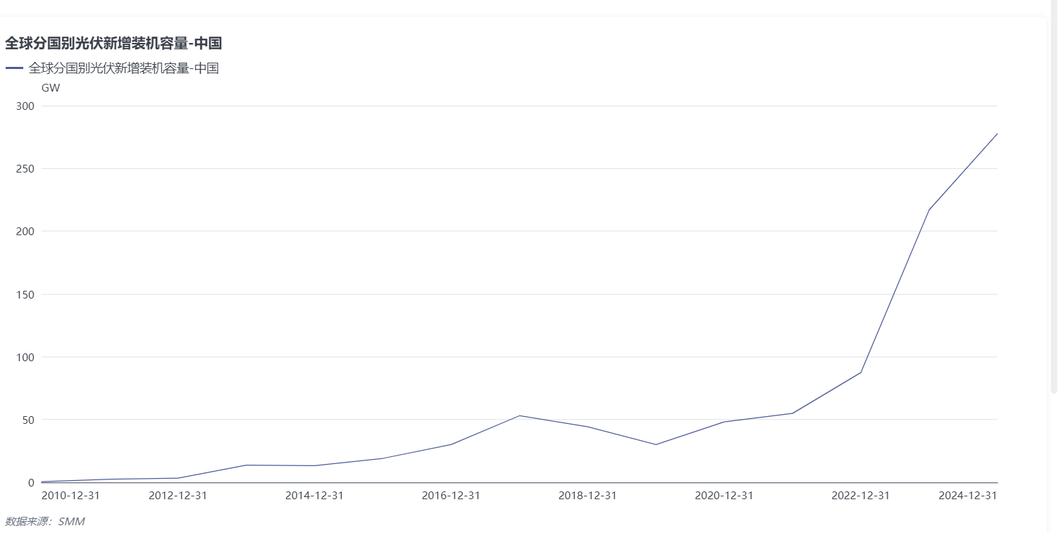 从以下趋势图可见,中国光伏新增装机容量在 2023 至 2024 年迎来爆发式增长,于这两年内各新增了217GW和278GW,较此前多年的发展态势呈现出跨越式跃升,充分体现出中国光伏产业在这一阶段的强劲扩张动力。据国家能源局统计,全国光伏发电机容量高达886吉瓦,其中以集中式光伏为主。