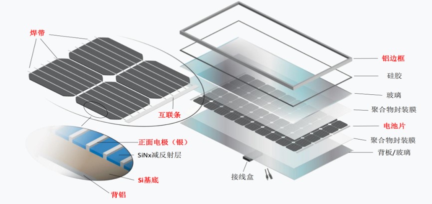 - 电池片:实现光电转换的功能层,主流材料为晶体硅(单晶/多晶)或薄膜半导体。